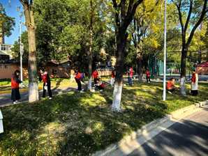 大家手持刷具,拎着小桶,分组协作,有序投入到树木涂白的劳动中。尽管天气微寒,但现场气氛热烈,同学们干劲十足,细致地为每一棵杉树穿上整洁的“白色新衣”。经过一个多小时的辛勤劳动,成排的杉树林焕然一新,白色树干在阳光下熠熠生辉,成为校园中一道亮丽而温暖的风景。